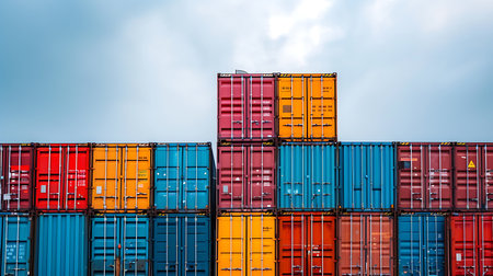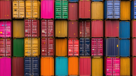 A vibrant arrangement of colorful shipping containers stacked for logistics. Solid background evoking a sense of order and industry. Mood of efficiency and global trade.
