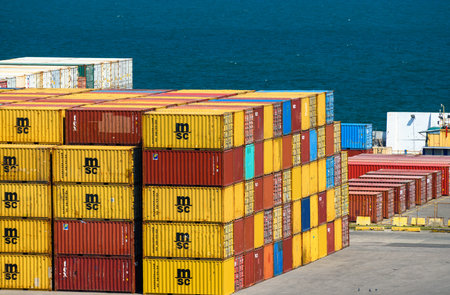 A close-up shot of containers stacked on a cargo ship, ready for transportation across the ocean. AI Generative