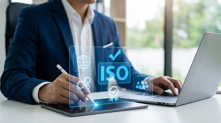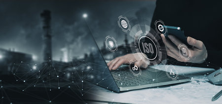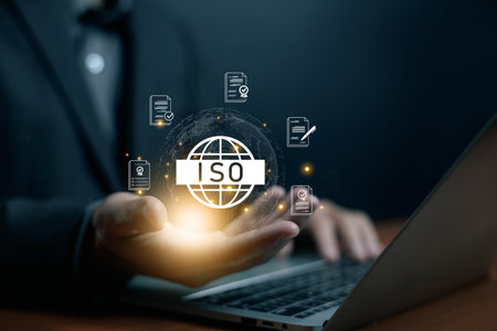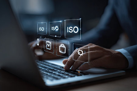 A person's hands work on a laptop, interacting with translucent digital icons representing ISO standards. The scene uses warm lighting, suggesting an indoor setting. The composition focuses on technology and business themes, suitable for illustrating quality assurance or technological implementation. It has potential uses in editorial and commercial projects.