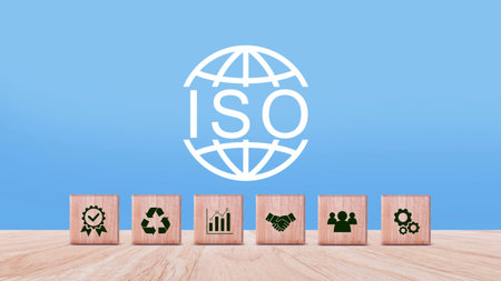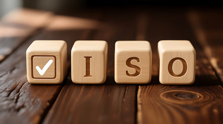 Display of wooden cubes spelling ISO, accompanied by a checkmark symbol, signifying commitment to quality and standards