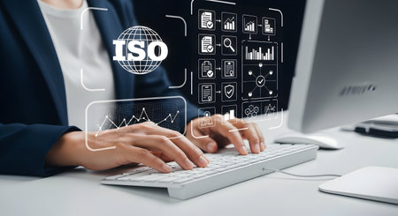 A person's hands are actively typing on a computer keyboard. A translucent digital interface hovers in front of them, prominently featuring the ISO logo with a globe. The interface also displays a series of icons representing processes, documents, checklists, graphs, and a shield, suggesting quality management, standards, and compliance.