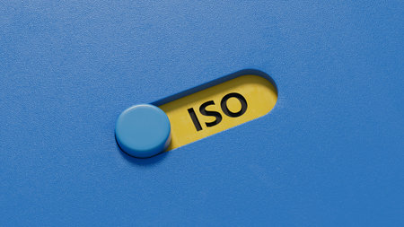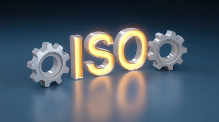 An iso quality management concept with illuminated letters and metallic gears, symbolizing standards and efficiency in business processes. this conveys sense of professionalism and innovation