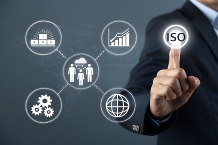 ISO Certification and Quality Management Concept with Business Icons and Touchscreen Interface