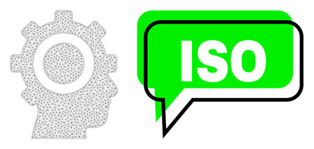 Shifted ISO green message speech shape and cyborg gear mesh composition. Vector flat cyborg gear, created from flat mesh. Green speech has ISO tag inside black frame, and colored banner.