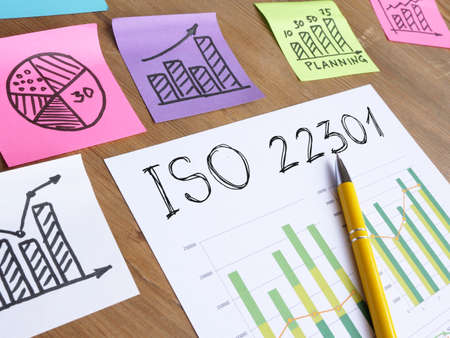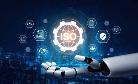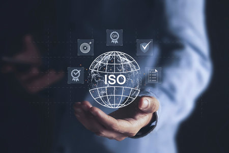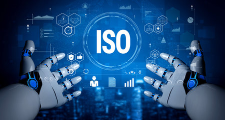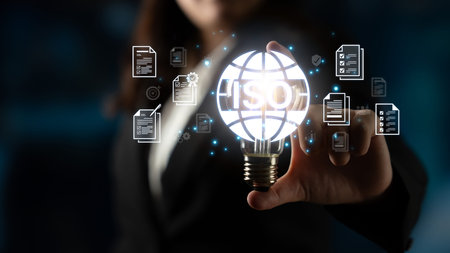 Concept of ISO certification for business quality management. This international standard ensures compliance, process control, and assurance for products and services.