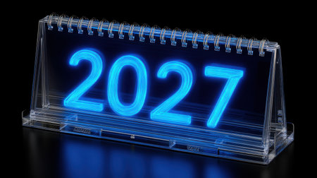 A striking desk calendar showing the year 2027 in neon blue on a sleek black background, perfect for modern office settings and decor.