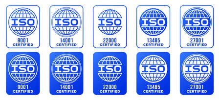A set of stamps for marking products. Certificate - ISO (International Organization for Standardization). A set of international standards for the quality of services and goods. Vector elements.