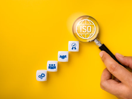 ISO certification and quality management concept with magnifying glass highlighting ISO symbol and process icons on dice. Represents standardization, compliance, and business quality assurance.