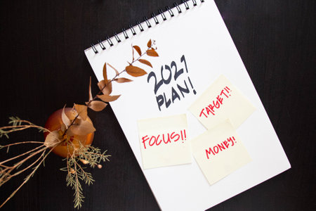 2021 plan notepad list concept, handwriting notepad. Inscription 2021 Plan in white paper and focus!, target!,money! in notepad, close up, top view, concept of planning, goal setting. On black background
