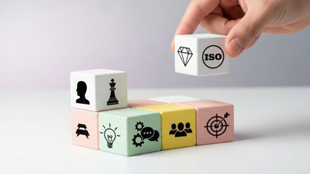 The image features a hand holding a block with the ISO icon prominently displayed. The block is part of a larger structure made up of several blocks, each featuring different symbols such as a chess piece, a light bulb, a gear, a paw print, and a target. The entire setup is isolated on a transparent background, making the colorful blocks stand out clearly.
