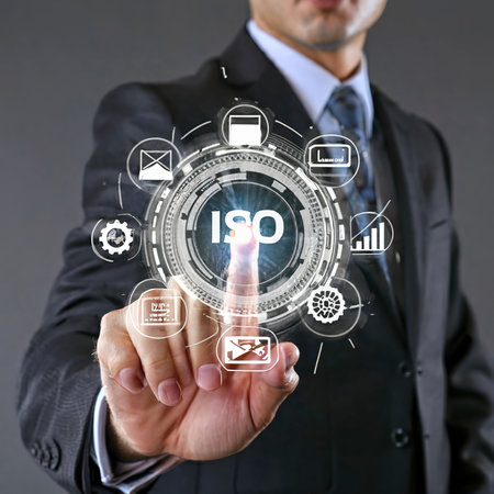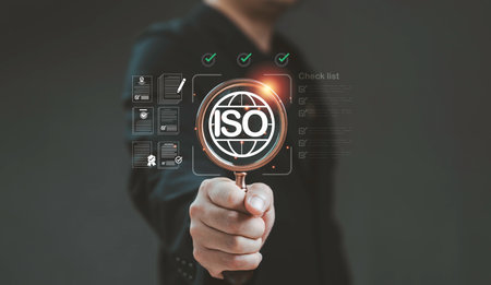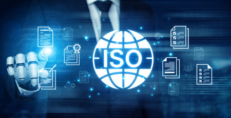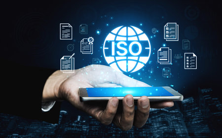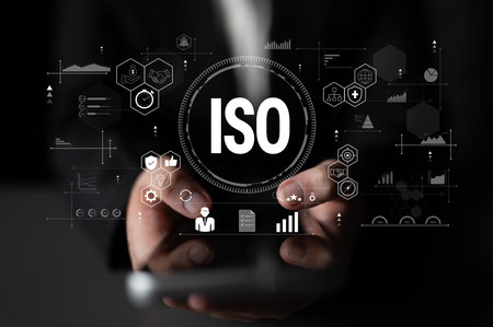 Concept of ISO certification for business quality management. This international standard ensures compliance, process control, and assurance for products and services.