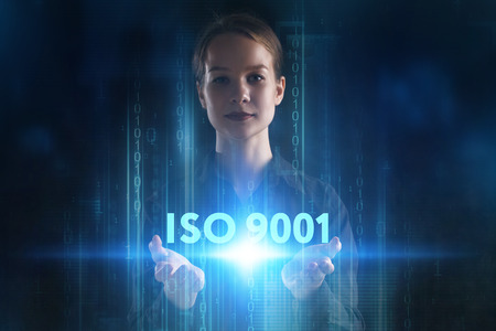 ISO 9001 Quality Management System Standards, projection on a virtual screen, Business and Technology Concept.