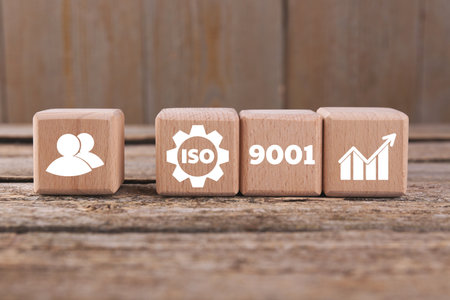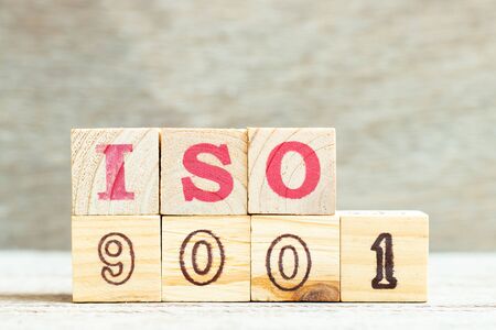 ISO 9001 Quality management systems. Cubes with different icons on wooden table