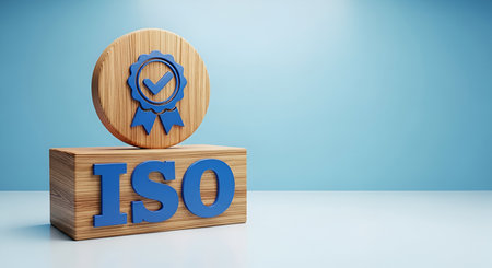 A wooden block with the blue letters ISO is placed on a white surface against a light blue background. On top of the block sits a round wooden element featuring a blue certification badge with a checkmark and ribbon design. The overall image conveys a sense of quality and standards.