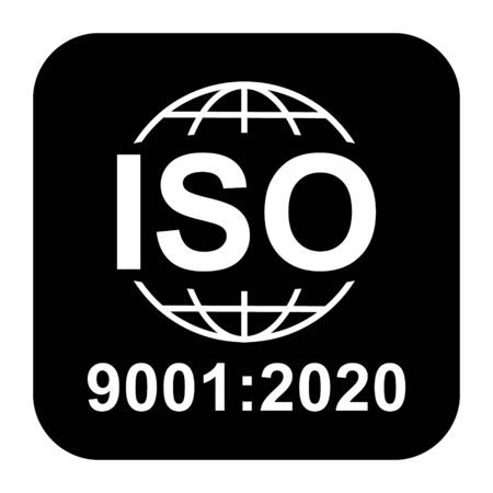 Iso 9001:2020 icon. Standard quality symbol. Vector button isolated on black background .