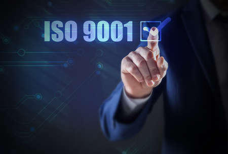 The concept of business, technology, the Internet and the network. A young entrepreneur working on a virtual screen of the future and sees the inscription: ISO 9001
