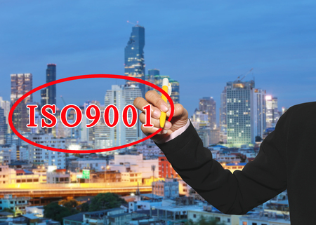 hand of a business woman use a pen write text system ISO9001 on city high rise building background.