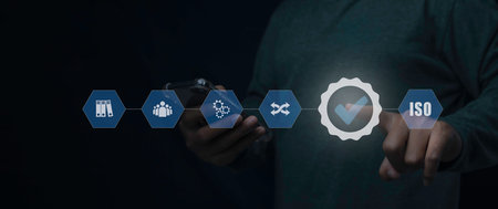 Quality control, certification and assurance concept according to ISO standards. Businessman using mobile phone with document and quality certification icons for ISO.