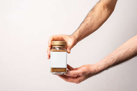 Male hand holding an instant coffee glass jar blank label isolated gray background, editable mock-up series template ready for your design, label selection .