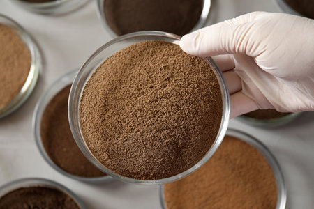 This image showcases transparent lab containers with yellow and white powder samples, ideal for scientific research and showcasing laboratory work processes.