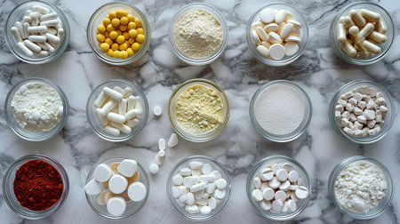 High angle view of various pills in glass bowlsle surface, flat lay