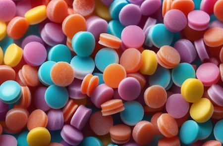 Vibrant multicolored candies creating a joyful pattern ideal for social media posts, food blogs, and festive visuals. Selective focus.
