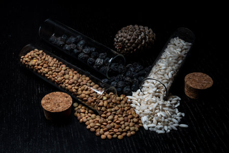 Colorful rapeseed, sunflower, wheat, pea, soy, and corn seeds in a petri dish in the lab