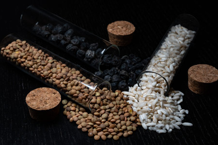 An assortment of culinary ingredients including spices, grains, and sugars is neatly organized in glass jars, showing their textures and colors on a dark surface.