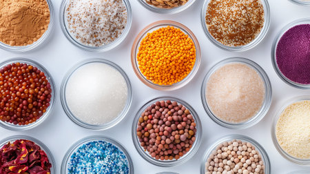 Small glass bowls filled with a diverse assortment of colorful spices, sugars, and decorative ingredients are neatly arranged on a white surface, showing off their vibrant hues.