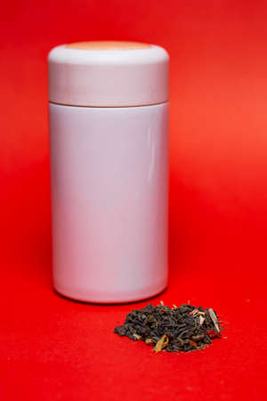 white thermo mug with green leaf tea on a red background