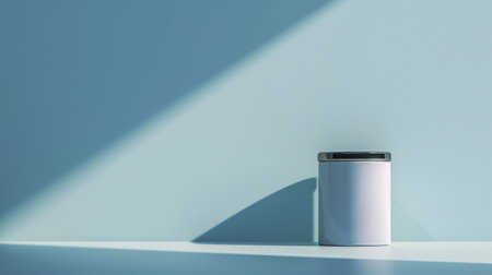 A minimalist white container sits elegantly on a wooden table, bathed in soft natural light. The shadows create a tranquil atmosphere perfect for relaxation.