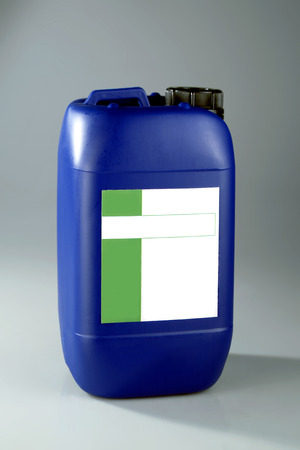 Blue plastic canister with tube on orange background