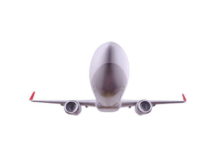 A twin-engined passenger plane on a clean white clipping background photographed from the front. Chassis released
