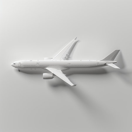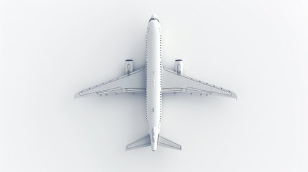 White showing top view of a white airplane keywords: airplane, aircraft, jet, passenger jet, commercial airplane, aviation, travel, transportation, flight, aerial view, top view, white, wings, fuselage, tail, engines, isolated, white background, air travel, aerospace, transport, vehicle, sky, journey, flying, modern aircraft description: a stark white passenger airplane is viewed directly from above, isolated against a white background. the aircraft's wings are extended, and its fuselage,...