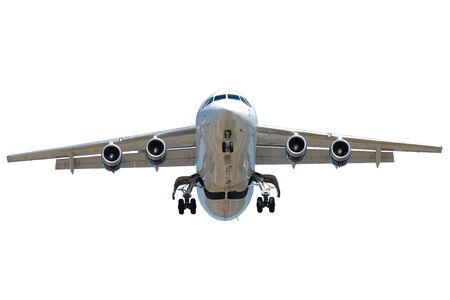 the plane flying to landing with released by the chassis, the bottom view on the white isolated background