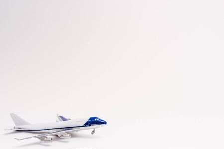 Model plane, airplane isolated on white background. Flat lay of miniature toy airplane. minimal trip and travel creative concepts. copy space