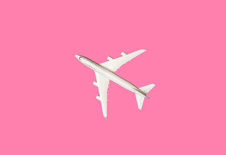 Model plane, airplane on pink pastel color background with copy space.Flat lay design.Travel concept on pink background. top view model plane on pink color background
