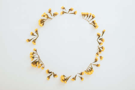 Round frame of yellow flowers on white background. Flat lay, top view. Floral design
