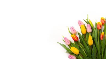 Banner with a bouquet of tulips on white background. Flat lay, top view with copyspace isolated on white. International Women's Day, spring concept.
