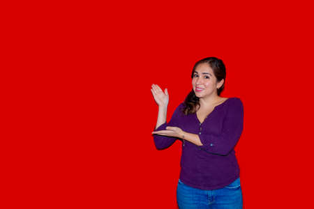 Image of a 30 year old caucasian woman with long brown hair looking at the camera and pointing with her fingers in the copy space isolated on red background