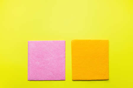 top view of bright pink and orange dishrags on yellow background