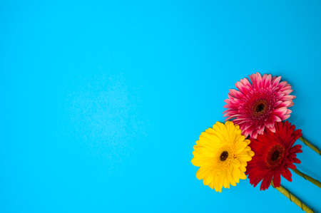 Three bright gerberas on a blue background template with place for text