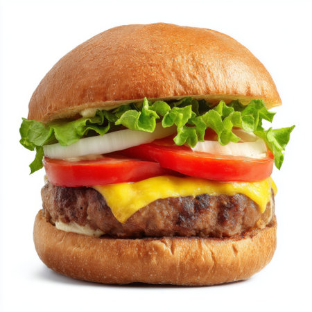 A freshly made cheeseburger featuring crisp lettuce, juicy tomato, sweet onion, and melted cheese on a soft bun, perfect for any meal.