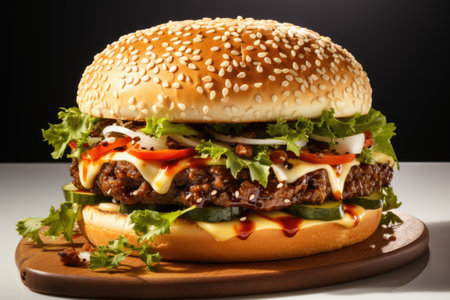 AI Generated. mouthwatering cheeseburger with sesame seed bun fresh lettuce and ripe tomatoes