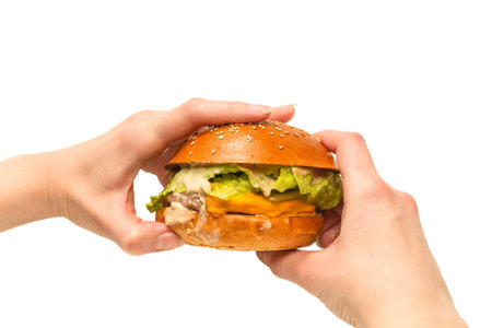 Cut out of a delicious burger held in female hands