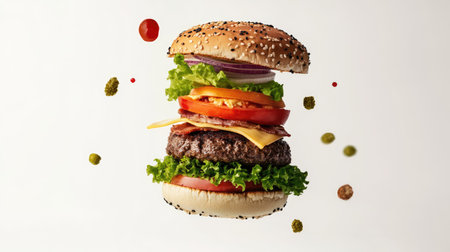Airborne burger assembly with ingredients floating above each other, isolated on a white background