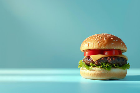 Tasty burger with sesame seeds on a blue background