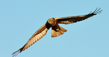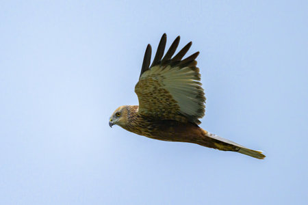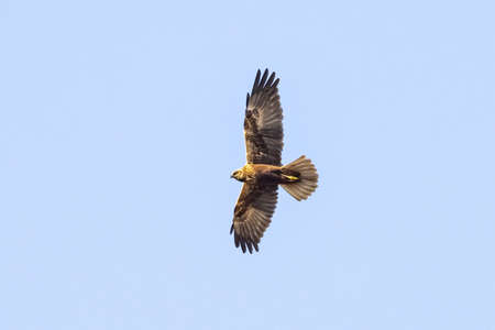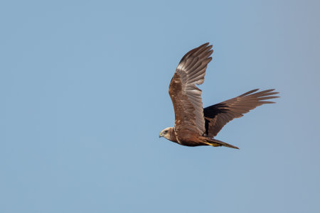 western marsh harrier Circus aeruginosus flying against clear blue sky