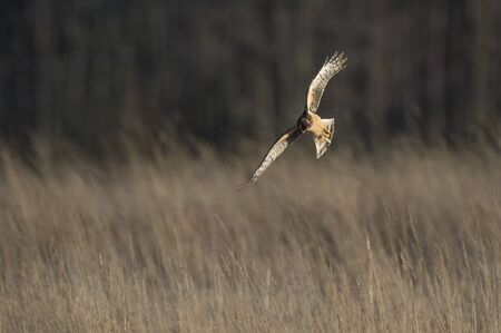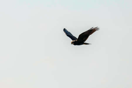 Marsh harrier in flight. The bird of prey in the sky with its wings spread over the vegetation in search of prey