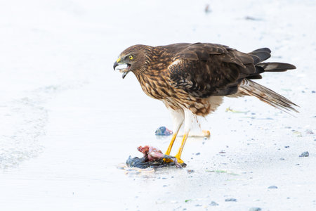 Australasian harrier or Circus approximans with recently caught prey at waters edge making a meal of it in Tauranga New Zealand.